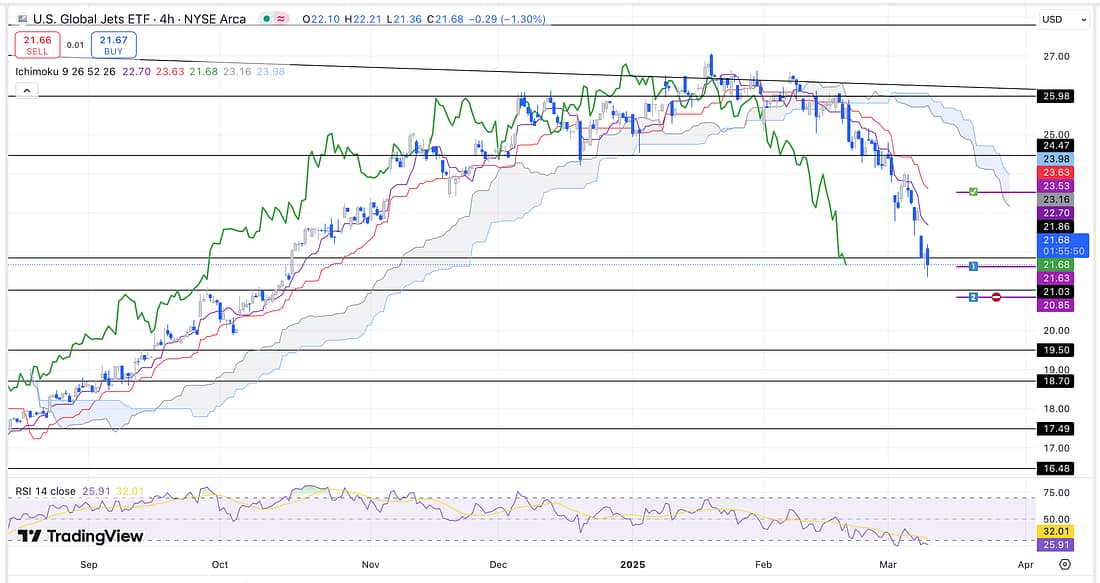 For exactly the same reasons as UAL (and the other short trades above), take full profits out of JETS as soon as possible.
