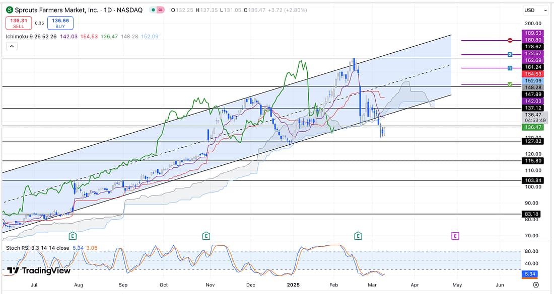In particular, the price action of SFM has now fallen out of the parallel channel, increasing the likelihood that it will return to the scene of the crime (at the least) before it continues any possible strong decline.