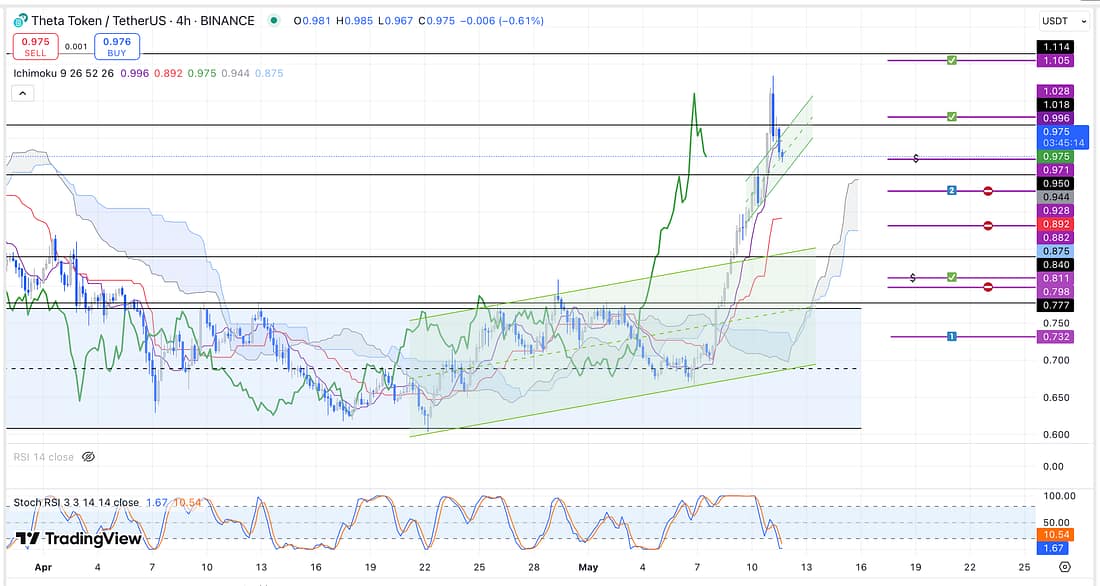 Continue to monitor THETA every 4 hours with the intention of moving the stop-loss upwards in order to lock in more profit.