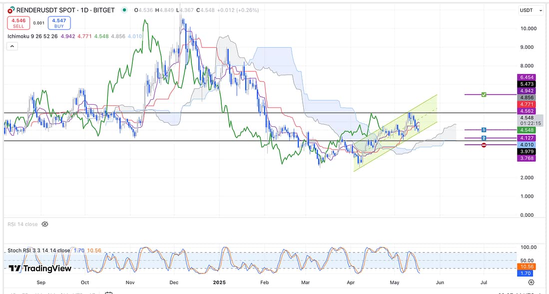 Buy a small quantity of RENDER because the price action is at the bottom of its parallel channel on its daily timeframe.