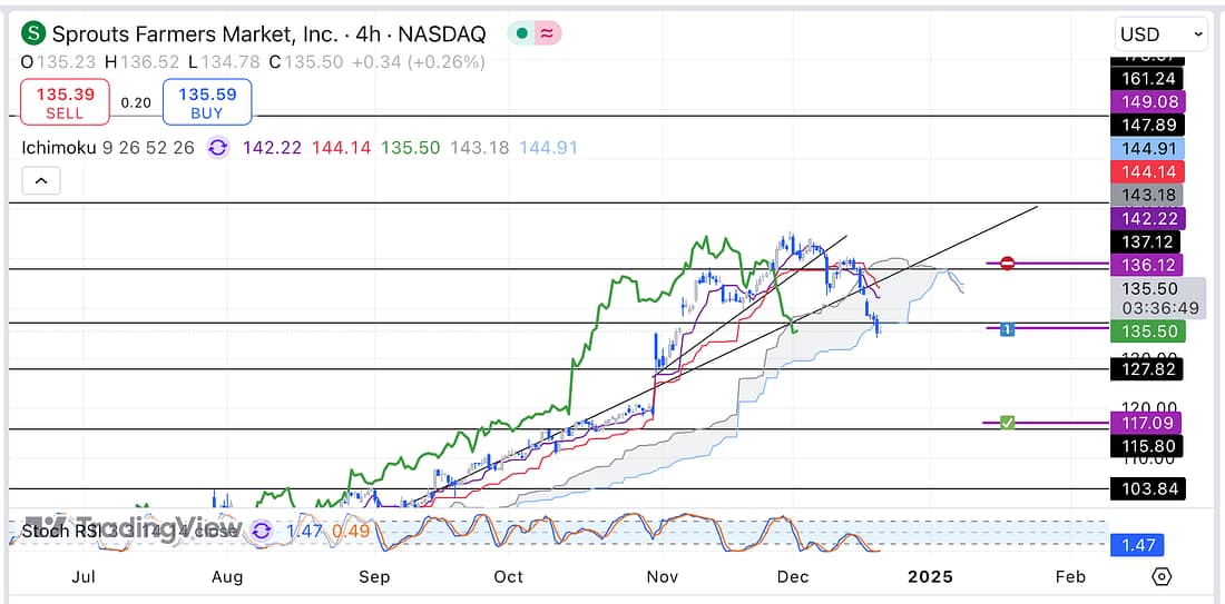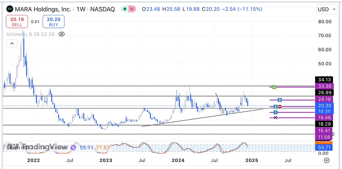 11. MARA – Bitcoin is declining strongly, and is likely to continue declining to the next support level as the lagging span has broken below the parallel trendline on the 4 hour timeframe. As a result, exit MARA as soon as possible: