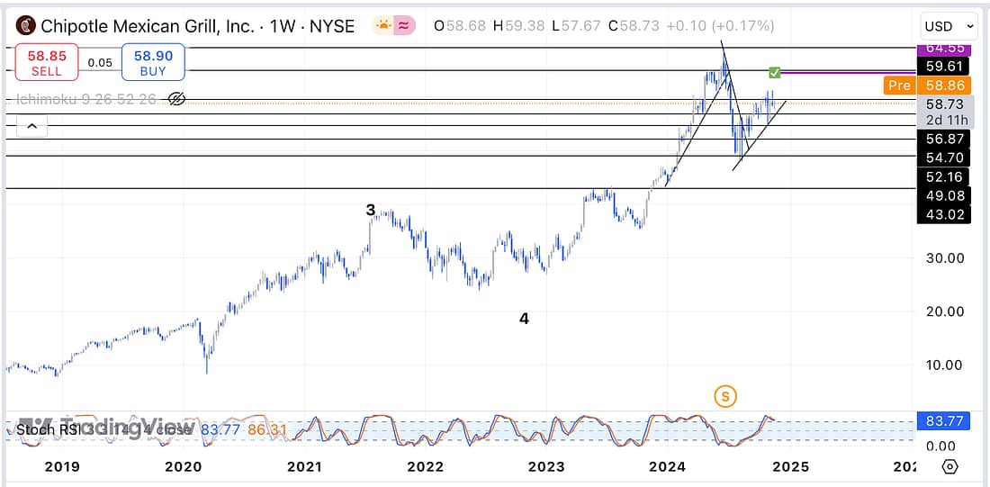 24. CMG – intriguingly, CMG looks ready to start rolling over (declining) soon on the weekly timeframe. Therefore, continue to monitor this stock everyday in order to keep up with your learning process: