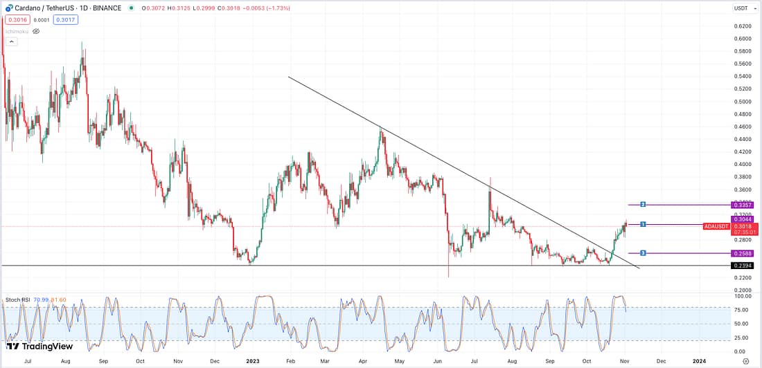 After looking at various Altcoins to Short such as SOL, ADA, MANA, GALA, and ENJIN, I decided to choose ADA because its price action on the daily timeframe appears to be more predictable. And it allows me to place a stop-loss around 10% away without a high probability of it being triggered by market noise.