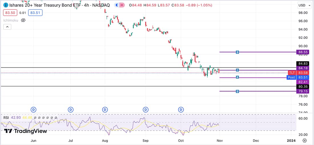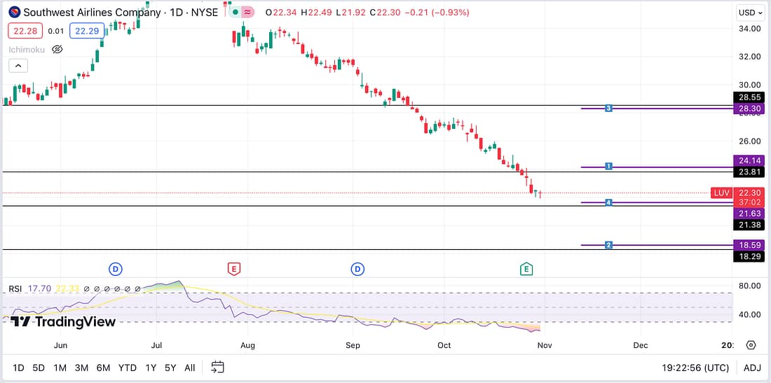 On the UAL, LUV, and TLT charts below, I have used purple lines with numbers to highlight those most probable levels.