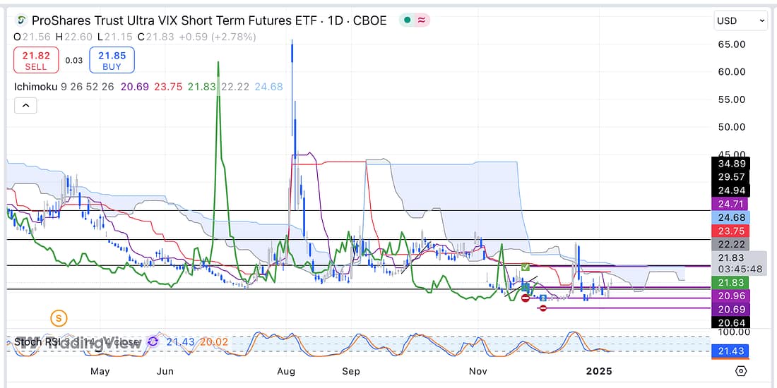 17. UVXY – (analysed) take 50% profit if possible at key resistance levels:
