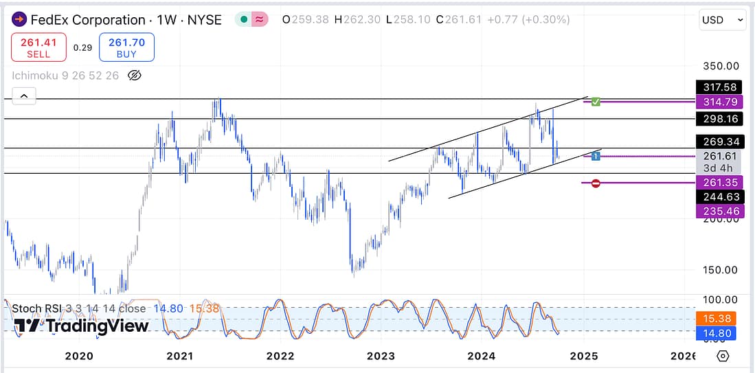 - FDX’s weekly Stochastic RSI has turned bullish after reaching the oversold area.